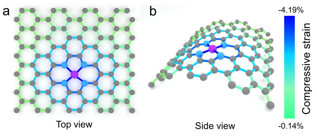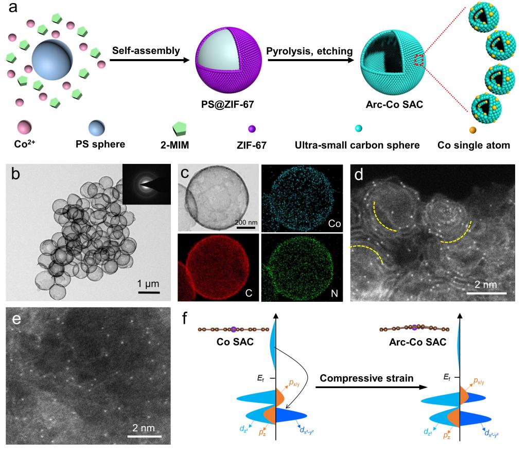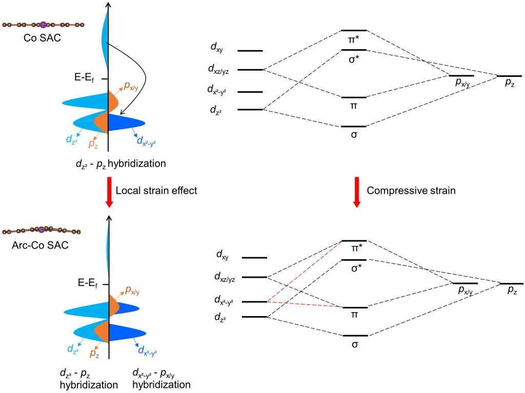 团队开发了一种受压缩应力的钴单原子催化剂,不仅能增强氧还原反应活性,还能作为空气电极在零度下促进锌-空气电池的充放电。在具有极小曲率半径(约2 纳米)的高度弧形碳层上担载钴单原子(Arc-Co-SAC)来产生压缩应变,这种局域压缩应力诱导钴单原子d轨道不同空间取向的电子发生了重新分布,径向(xy平面)电子填充数增加,从而增强了其与活性中间体分子的有效电子轨道重叠程度,提高了氧还原的活性。