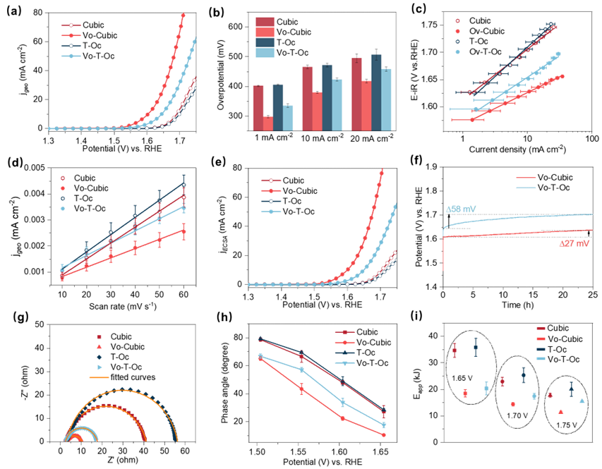 本研究首先合成了暴露(001)面的立方体Co3O4,以及主要暴露面为(111)的截断八面体Co3O4,并在其表面引入氧空位。研究结果发现,产生氧空位后,Co3O4(001)面具有优异的OER活性,其起始过电位为298 mV,明显优于暴露(111)面的Co3O4(335 mV)。系统的电化学表征、化学探针、原位光谱耦合同位素实验以及理论计算结果表明,因氧缺陷的引入,Co3O4的(001)晶面由吸附演化机理(AEM)转变为晶格氧氧化机理(LOM),突破了线性标度关系的限制,具有更高的OER活性,而(111)晶面仍遵循AEM机理。该研究成果为通过在特定晶面引入缺陷提高催化剂电解水制氢效率提供了新的研究思路。