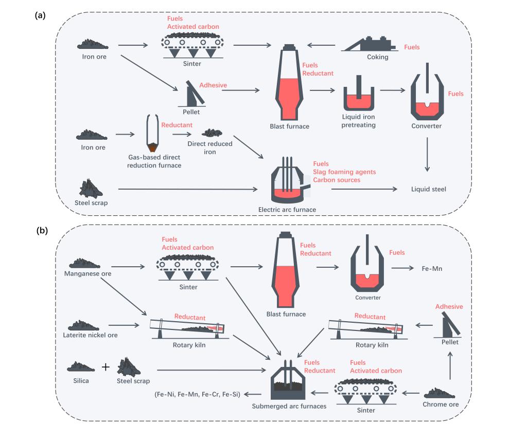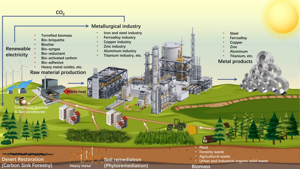 团队从四个维度—生物质基原料的制备、其在冶金过程中的创新应用、植物修复与金属提取的前沿进展、碳汇林业的实践与潜力进行了全面而深入的探讨。在生物基原料的范畴内,如生物质基燃料、还原剂、粘结剂、活性炭、渗碳剂和发泡剂等,均展现出其独特的价值。它们不仅能够作为能量供应体,还能充当还原剂和粘合剂的角色,有效处理冶金过程中产生的烟气,同时调整金属熔体的成分。这一系列作用共同促进了冶金过程能源效率的提升,显著降低了二氧化碳的排放量。此外,通过生物质介导的土壤修复技术,可以实现对重金属的植物富集,进而通过加工这些植物来获得冶金所需的原材料,开辟了一条生态友好的资源循环路径。同时,利用冶金过程中产生的废热来制备生物质土壤改良剂,不仅修复了沙漠化土地,还通过森林碳汇的作用,间接减少了冶金行业对大气中二氧化碳排放的贡献。本研究成果不仅为生物质冶金的理论发展提供了坚实的基础,更为实现冶金行业的绿色转型和可持续发展指明了方向。