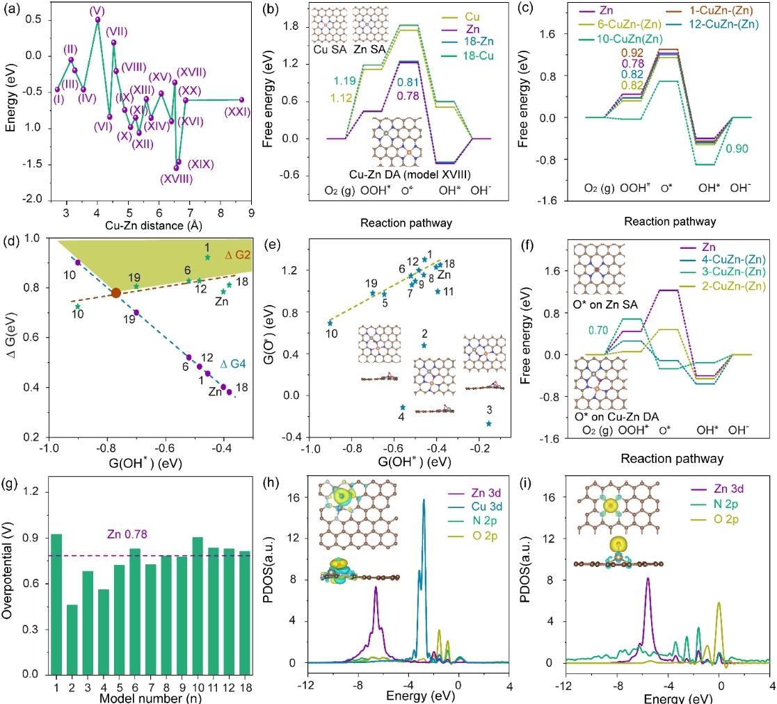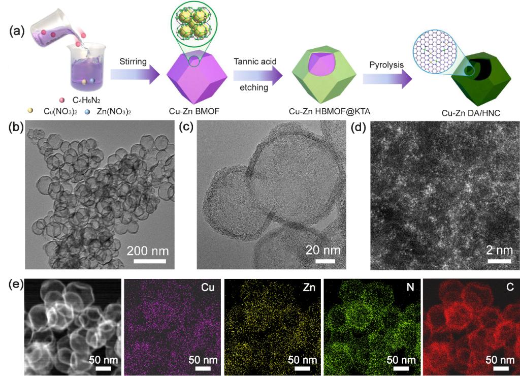 本研究利用柯肯达尔效应构建了空心碳负载的N桥连Cu-Zn 双原子催化剂(Cu-Zn DA/HNC),催化剂的空心结构有利于增强传质和暴露更多的活性位点,另外Cu和Zn原子之间共享的N原子有利于增强双原子间的协同效应,有利于与O*结合,降低ORR反应能垒。所得到的N桥连Cu-Zn 双原子催化剂在碱性电解质中表现出优异的ORR活性,接近ORR 4e-过程。所构建的锌空气电池可以在空气中稳定充放电运行近900小时左右,并表现出较强的低温耐受性。研究成果为高活性双原子催化剂的开发提供了设计原则和思路,有利于实现N桥连双原子催化剂在锌空气电池中的应用。
