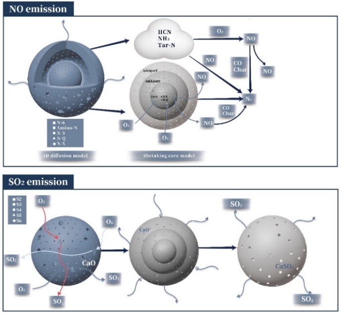 基于城市污泥与煤矸石在结构与组成方面的差异,团队开展了两固废掺烧试验研究,对燃烧过程中氮氧化物(NOx)与二氧化硫(SO2)进行连续在线监测,考察了掺烧工艺对气体污染物释放规律影响,并结合燃烧烟气组成、矿物质及灰渣成分和热力学分析等手段对气体污染物释放规律进行了分析,阐明了掺烧过程中两气体释放的动力学特征及原位减排作用机制。结果发现,城市污泥与矸石掺烧可有效显著减少NOx和SO2的释放。掺烧过程中挥发性氮和焦炭氮的释放分别服从三维扩散及收缩核模型,贫氧气氛的形成以及强化的均相和非均相还原反应均有助于减少NOx的释放。SO2的释放服从三维扩散模型,灰渣中的含钙组分有利于原位固硫。以上研究结果为工业锅炉处置多元含碳固废及污染物控制提供了理论依据和技术参考。