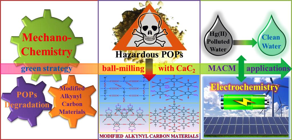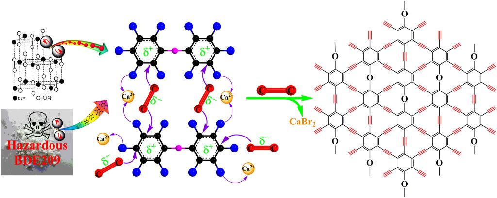 团队采用机械化学技术来激活电石的反应活性,从而使之与有机含杂原子的多卤化物反应,实现了几种掺杂炔碳材料的合成,并对其应用性能进行了开发。具有POPs特性的十溴二苯醚通过与电石的机械化学反应,被高效转化为具有独特结构和高电化学性能的含氧石墨炔。该过程通过炔基对卤素的亲核取代,构建了具有炔基键接的二维碳骨架结构。在较为温和的反应条件下,十溴二苯醚高效地转化为高附加值的碳材料,体现了该绿色过程的高效性、环保性和经济优势。所合成的含氧石墨炔具有炔基键接的碳骨架、发达的孔隙、高度有序的多层结构以及原位掺杂的含氧集团等独特的组成和结构。研究发现,该含氧石墨炔具有典型的超电容性能、较高的比电容、良好的倍率性能、出色的电导率和优异的循环稳定性,在储电和导电方面具有广阔的应用前景。该工作通过机械化学策略,实现了功能性氧基石墨炔的高效合成与有害物质的绿色降解的有机结合,为先进炔碳材料的开发和溴化阻燃剂的资源化利用提供了新思路。
