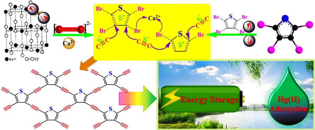 团队通过机械化学激发电石的反应活性,使之与四溴噻吩反应,实现了原位硫掺杂石墨单炔的高效合成。通过活性炔基对中四溴噻吩溴的深度亲核取代,构建了具有炔基键接的噻吩碳骨架结构的二维原位硫掺杂石墨单炔;该机械化学合成工艺高效、经济、绿色,相较于目前已有的其他炔碳材料合成方式,更具有工业化潜力。所得原位硫掺杂石墨单炔具有炔基键接的噻吩碳骨架、原位掺杂的含硫集团、纳米片状的主体形貌、分级多孔的孔隙以及有序的内部结构等的独特组成和结构。研究发现,作为Hg(II)的吸附剂,其表现出快速的吸附行为、超高的Hg(II)吸附量、优异的可回收性和良好的选择性;而作为超级电容器电极材料,其展现出典型的超级电容行为、较高的比电容、良好的导电性和优异的长周期循环稳定性。该工作实现了原位硫掺杂石墨单炔的高效合成,为原位掺杂石墨单炔的合成提供了一条绿色可行的路线,也为石墨炔类炔基碳材料的精确合成和结构调控研究提供了助力。