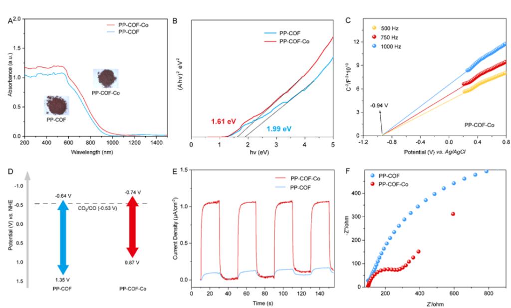 团队以苝二酰亚胺(PDI)为光敏单元,1,10-菲咯啉为金属配位位点,通过溶剂热聚合构建了一维ABC堆叠结构的共价有机框架(PP-COF),并进一步通过后合成金属化引入钴离子,获得PP-COF-Co。通过X射线衍射、X射线光电子能谱和氮气吸附等表征手段,证实了材料的高结晶性、均匀的钴配位环境以及微孔结构。理论计算与实验分析表明,钴的引入显著增强了π共轭体系的电子离域性,将材料带隙从1.99 eV降至1.61 eV,并通过d-π轨道协同效应促进光生电子-空穴对的高效分离,单线态氧(¹O₂)生成速率提升至4.67μM/s,较未金属化材料(2.33μM/s)实现倍增。