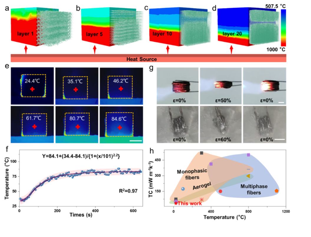 团队提出了一种通过热诱导相变与界面演化行为调控硅锆陶瓷纳米纤维构型熵值及热物理特性的新策略,结合压力辅助收集技术优化纤维细度、长径比与堆叠结构,成功制备了多尺度结构陶瓷纤维气凝胶材料,在机械、声学、隔热及微波吸收方面都展现出优异性能,解决了传统陶瓷气凝胶脆性与高温性能衰减的难题。