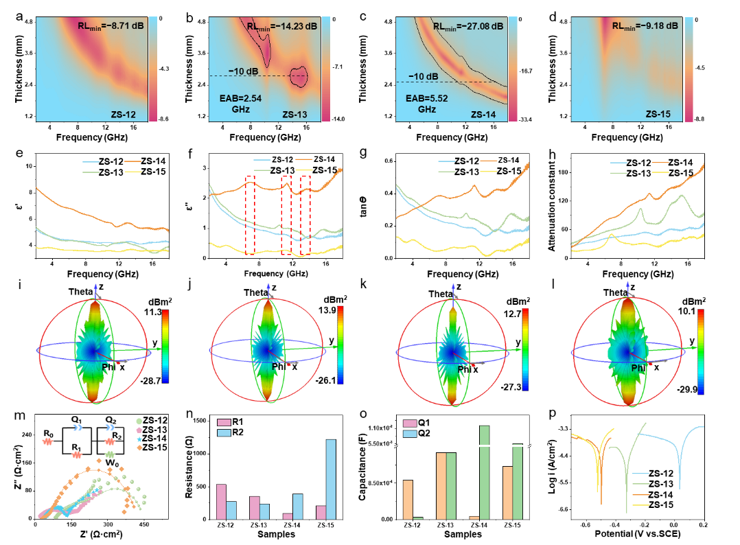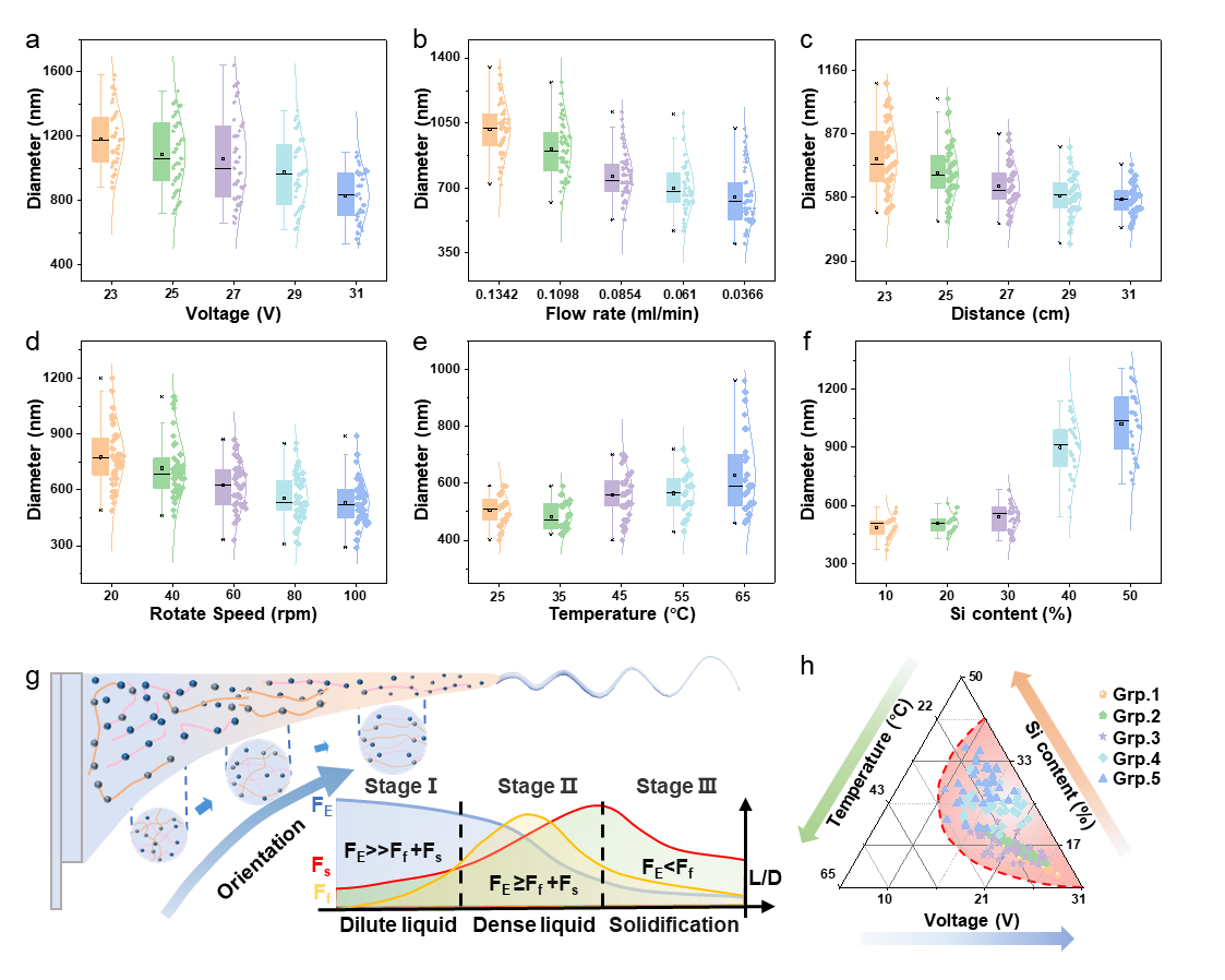工作系统地研究了电压、流速、硅含量等参数对纤维细度的影响,揭示了溶剂蒸发、聚合物黏度与静电拉伸力的动态平衡机制,实现了高长径比纤维的稳定制备。研究表明,基于超薄多层结构设计形成的热阻效应使制备的材料在极寒(-196 ℃)和极热(1300 ℃)环境中均能展现出优异的静动态隔热性能,研制的纤维气凝胶材料反射损耗达-27.08 dB,有效吸收带宽5.6 GHz,雷达散射信号强度低,适用于微波隐身领域的应用。