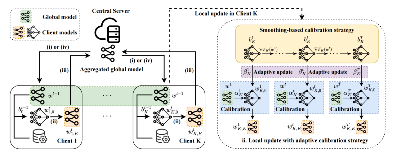 联邦学习作为一种保护数据隐私的分布式计算框架,允许多个客户端在不共享原始数据的情况下协同训练模型。然而,现实场景中,统计异构性、资源约束和公平性等问题限制了其实际应用。针对统计异构性导致的聚合差距问题,团队提出了pFedCal算法,通过轻量级自适应校准策略,在模型初始化阶段引入基于全局梯度和最新梯度偏差的校准补偿,有效降低计算开销并提升公平性。理论分析表明,在适当的学习率下,pFedCal可收敛至非凸损失函数的一阶平稳点。
