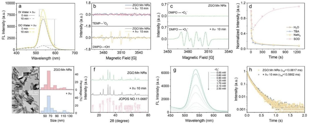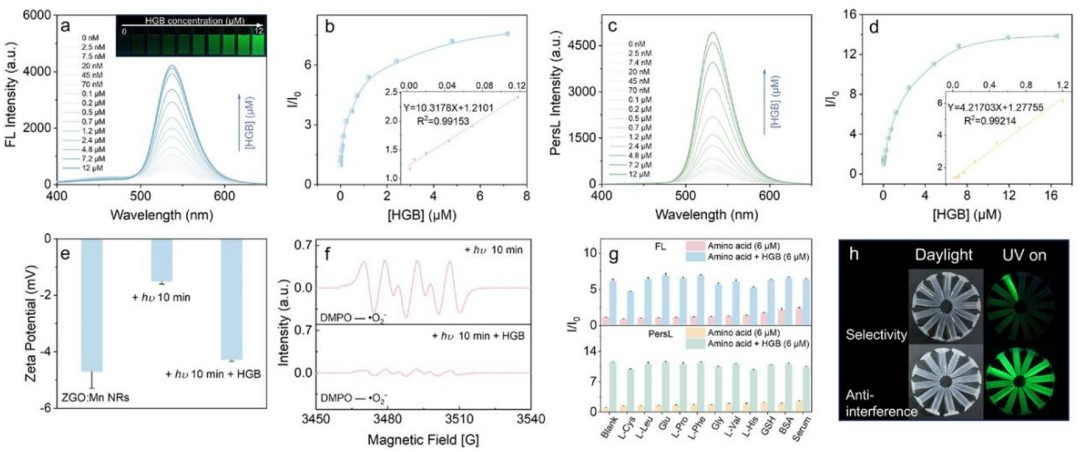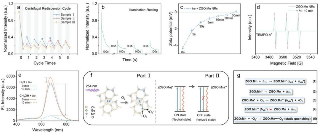 荧光团在长时间高能激发光光照下后会暂时失去或永久失去其发光能力,通常意味着荧光团的微观结构和组成由于各种光化学反应(如氧化还原反应、分子内重排、断裂或与其他分子反应)而发生不可逆的变化。目前科研人员对半导体量子点、稀土掺杂纳米晶体、分子染料和荧光蛋白等材料的光谱白过程进行了详细研究,但是对光漂白的探索仍然有限,特别是对于具有新发光特性的材料。ZGO:Mn NRs作为一种新型的光学材料,具有能够在没有连续光激发的情况下储存激发能并持续发光的特性,在数据存储、防伪、传感和生物成像等应用中极具价值。如何将光漂白效应,传统上被认为是分析传感领域的局限,用于调控传感体系中光信号,进而实现对各种分析物的光学传感,将有助于新型的光学传感器的设计。