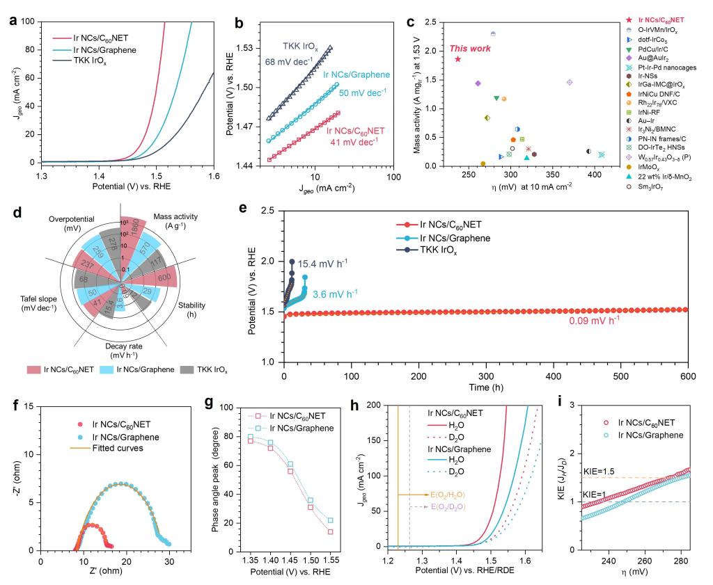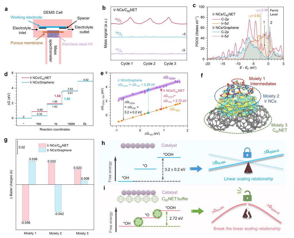 在电催化析氧反应(OER)中,含氧中间体(*OH、*O和*OOH)之间存在吸附能的线性标度关系,这一结构–性能耦合规律严重制约了催化剂活性的理论上限。团队提出了一种通过二维富勒烯网络(C60NET)的电子缓冲效应打破该标度关系的新策略。在构建的Ir纳米簇/C60NET(Ir NCs/C60NET)催化剂中,C60NET能够根据反应中间体的变化动态调控Ir活性位点的电子结构,从而调节*OH、*O和*OOH的吸附强度,打破它们之间的线性关系。这种电子缓冲作用显著提升了催化剂的本征活性和稳定性,使其在酸性电解液中展现出优异的OER性能,表现为低至237 mV的过电位和超过600小时的稳定运行寿命。对比实验和理论计算进一步揭示,C60NET通过可逆电子转移调控Ir氧化态演变,减缓Ir的过度氧化,有效提升了催化剂的结构稳定性和利用效率。本工作为针对单一活性位点打破标度关系以及高性能OER电催化剂的设计提供了新的思路。