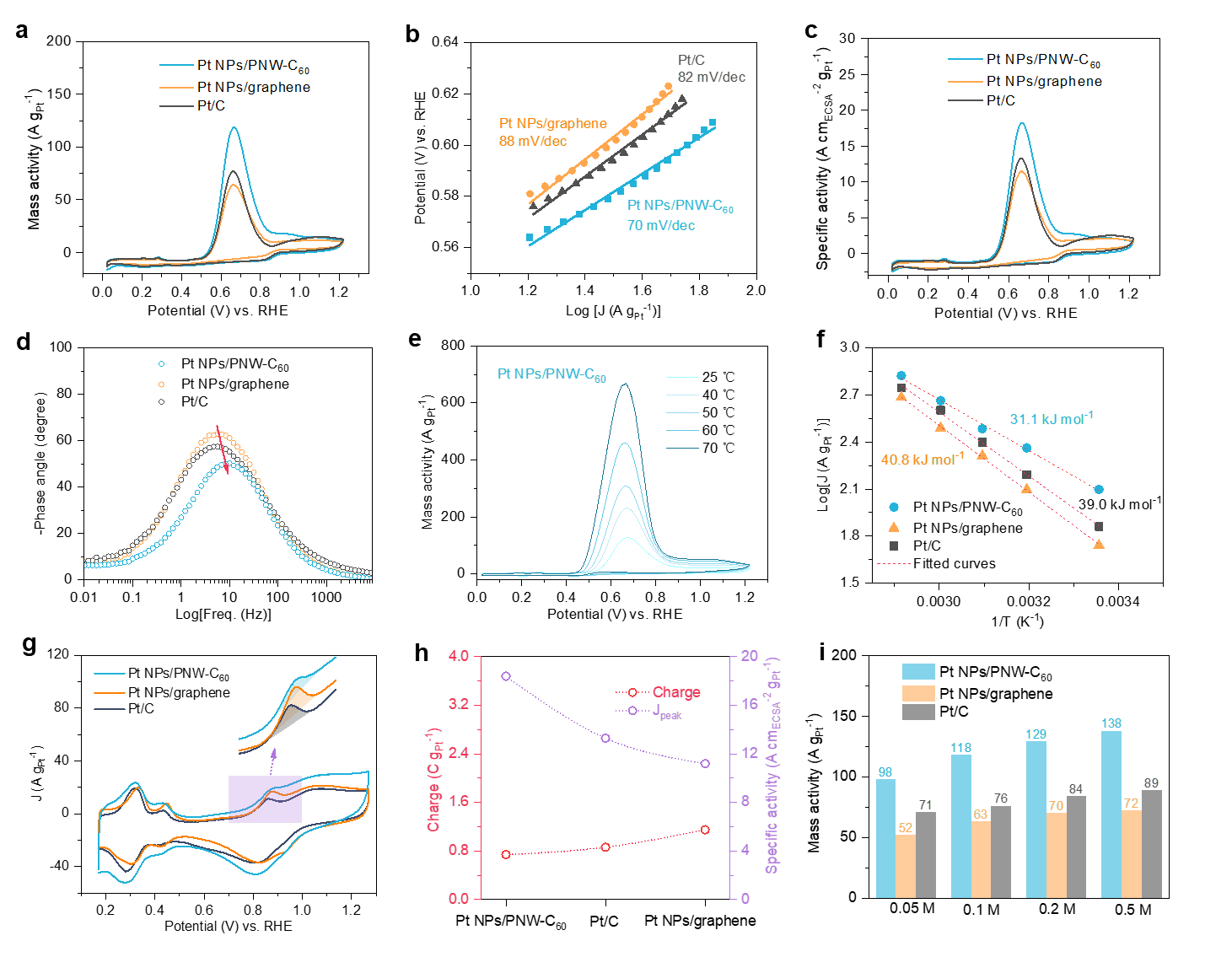 氨因其生产、储存和运输技术成熟,被认为是一种极具前景的氢载体。此外,通过电催化氨氧化反应(AOR)制氢所需的理论电位显著低于水电解。然而,AOR反应动力学缓慢及其稳定性差,限制了氨电解的工业化应用。我们构建了由二维共价键合的富勒烯聚合网络(PNW-C60)负载的铂纳米颗粒(Pt NPs)催化剂,可作为一种高活性和高稳定性的AOR电催化剂。二维富勒烯聚合网络独特的电子缓冲效应有助于含氮中间体的脱附,并缓解其在Pt NPs表面发生毒化。因此,所制备的富勒烯聚合网络负载的Pt NPs在AOR反应中表现出高达118 A gPt⁻¹的峰电流质量活性以及较好的稳定性,性能优于商业Pt/C和石墨烯负载的Pt NPs催化剂。本研究采用具有较大比表面积和独特电子结构的少层富勒烯网络作为金属载体,不仅拓展了二维富勒烯网络的应用范畴,而且对于开发高活性和稳定性的Pt基AOR催化剂具有一定的借鉴意义。