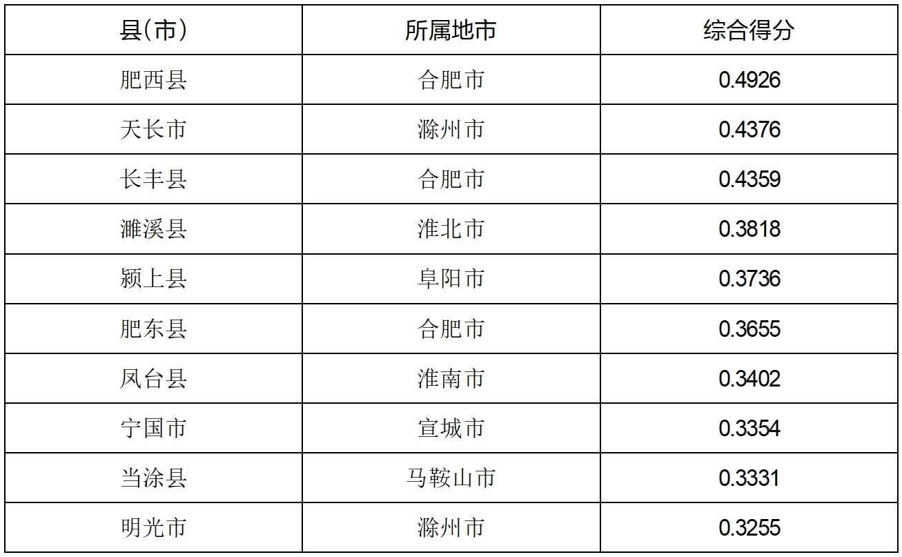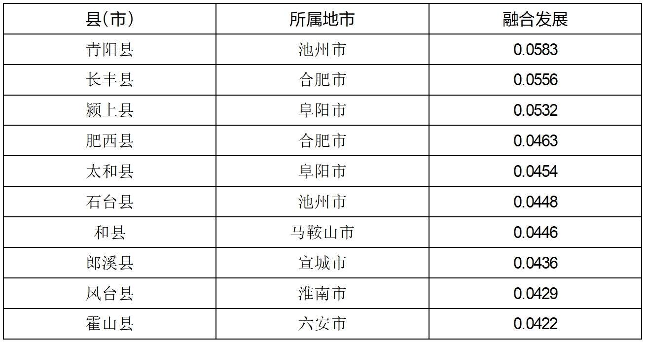 (4)安徽县域城乡融合发展分析。根据人口出生率、新增常住人口、城乡居民人均可支配收入之比及一般公共预算财政收入占GDP比重等指标的综合测评结果显示,青阳县、长丰县、颍上县、肥西县、太和县、石台县、和县、郎溪县、凤台县和霍山县等县(市)名列前茅。从地区分布来看,池州、合肥和阜阳均有2个县(市)进入全省前十位,马鞍山、宣城、淮南和六安各有1个县(市)进入全省前十位。