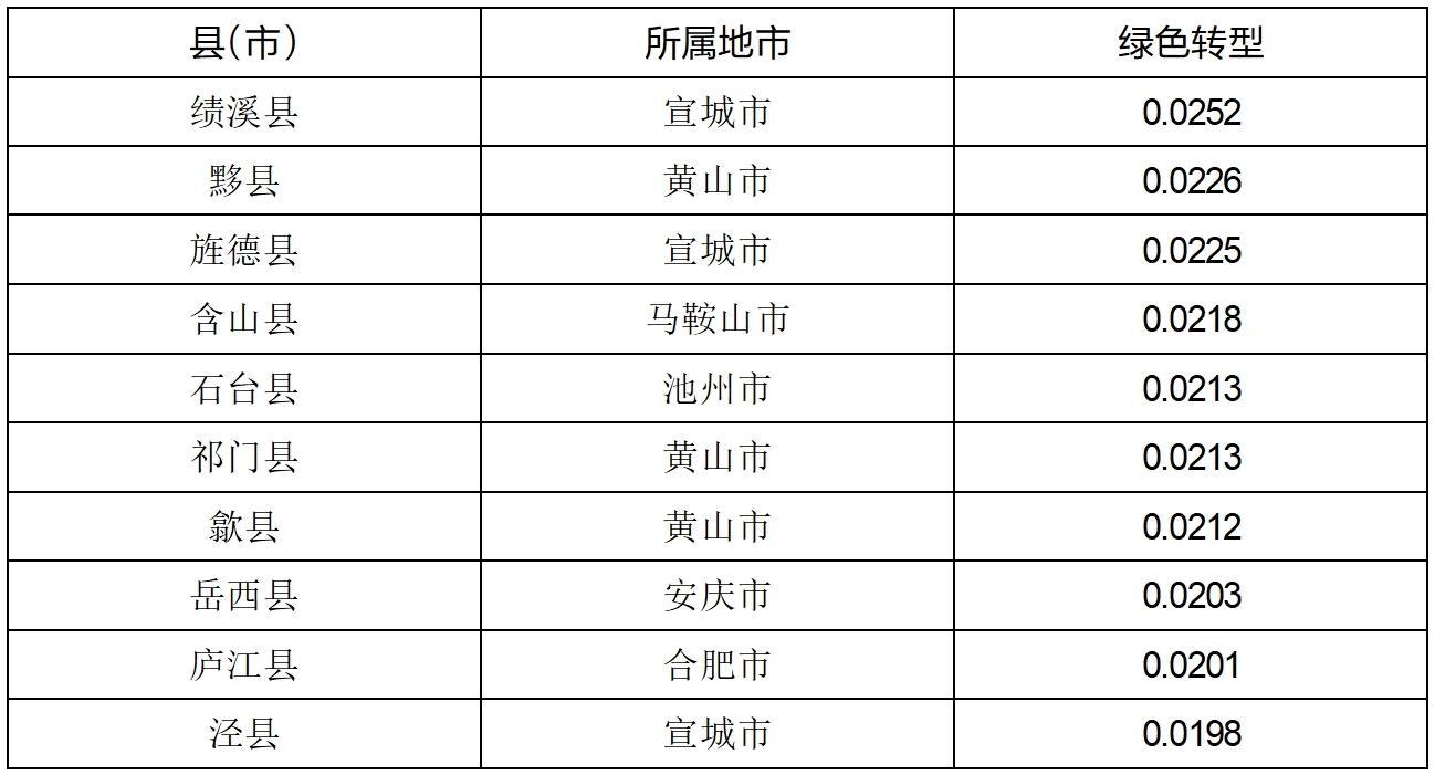 (5)安徽县域绿色转型发展分析。根据PM2.5年均浓度、单位GDP能耗量等指标的综合测评结果显示,绩溪县、黟县、旌德县、含山县、石台县、祁门县、歙县、岳西县、庐江县和泾县等县(市)名列前茅。从地区分布来看,这些县(市)主要分布在宣城、黄山、马鞍山、池州、安庆和合肥,呈现出一定的区域集聚特征。