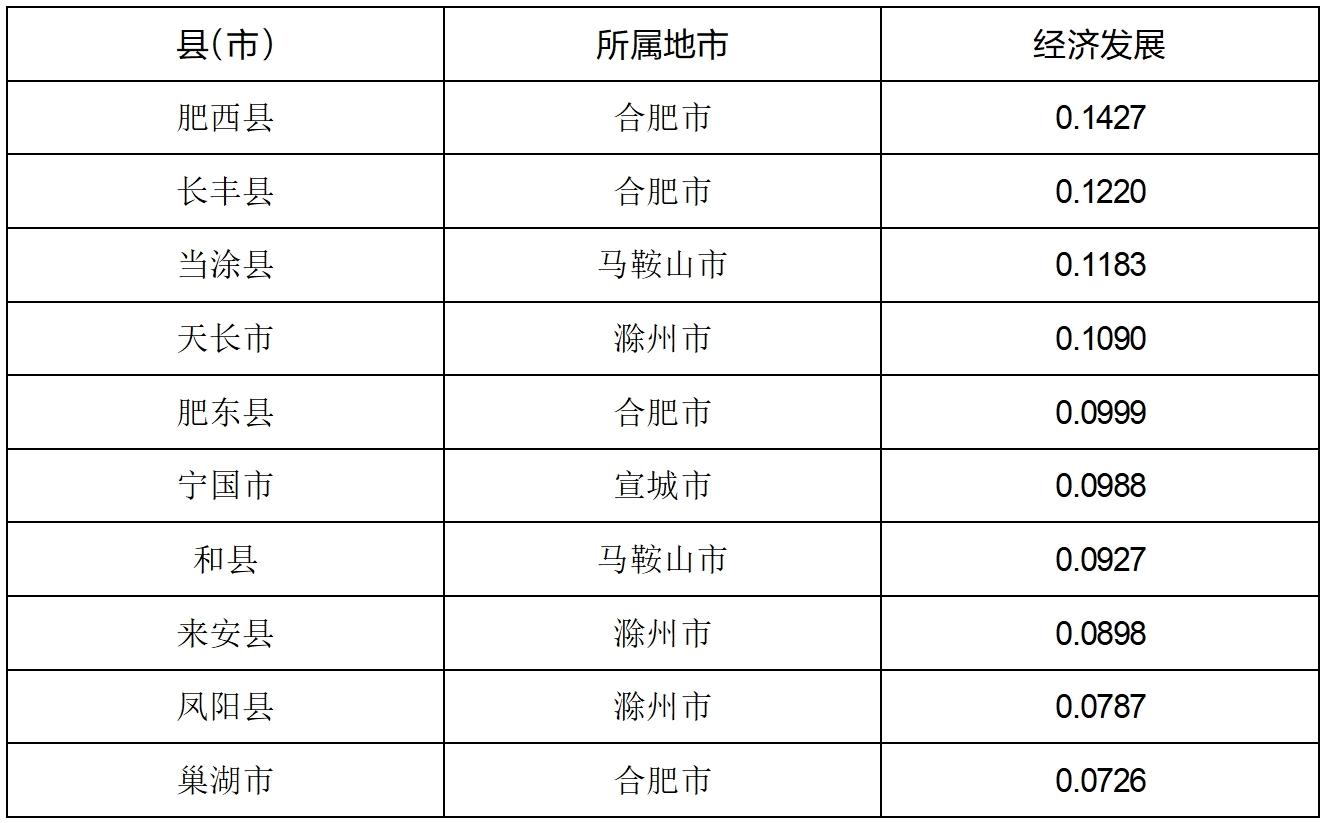 (2)安徽县域经济发展分析。根据GDP、GDP增长率、人均GDP、工业增加值占GDP比重及固定资产投资增速等指标的综合测评结果显示,肥西县、长丰县、当涂县、天长市、肥东县、宁国市、和县、来安县、凤阳县和巢湖市等县(市)名列前茅。从地区分布来看,合肥有4个县(市)进入全省前十位,占据绝对优势;滁州、马鞍山和宣城的县(市)在全省也具有一定的竞争力,分别有3个、2个、1个县(市)进入全省前十位,总体上与高质量发展排名情况较为接近。