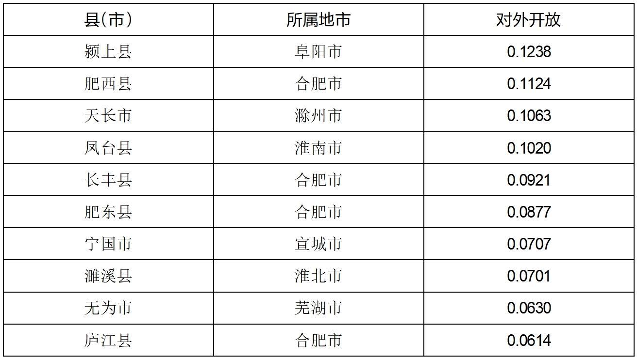 (6)安徽县域开放发展分析。根据经济外向度、实际利用外商直接投资等指标的综合测评结果显示,颍上县、肥西县、天长市、凤台县、长丰县、肥东县、宁国市、濉溪县、无为市和庐江县等县(市)名列前茅。从地区分布来看,合肥有4个县(市)进入全省前十位,阜阳、滁州、淮南、宣城、淮北和芜湖各有1个县(市)进入全省前十位。