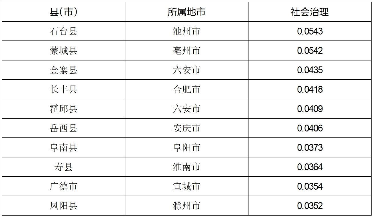 (8)安徽县域社会治理水平分析。根据城镇新增就业人数、城镇登记失业率和一般公共预算财政支出占GDP比重等指标的综合测评结果显示,石台县、蒙城县、金寨县、长丰县、霍邱县、岳西县、阜南县、寿县、广德市和凤阳县等县(市)名列前茅。从地区分布来看,六安有2个县(市)进入全省前十位,池州、亳州、合肥、安庆、阜阳、淮南、宣城和滁州各有1个县(市)进入全省前十位。