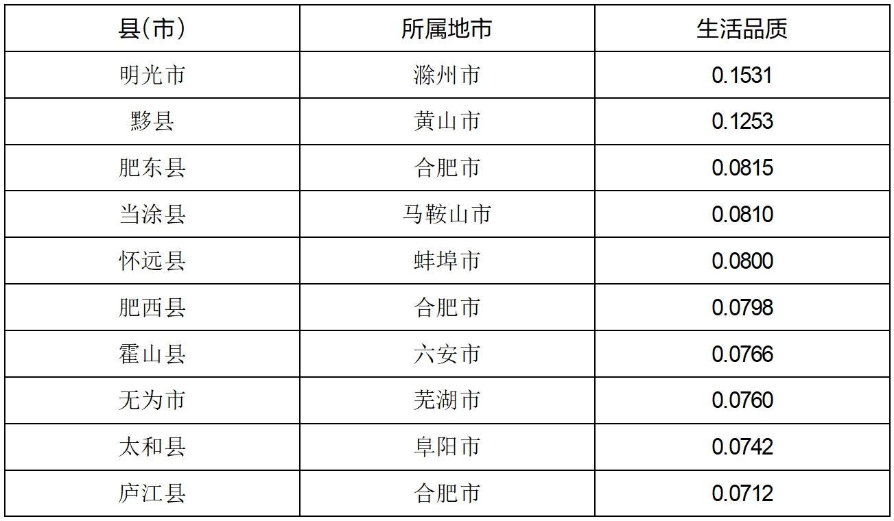 (7)安徽县域生活品质分析。根据城镇居民人均可支配收入、农村居民人均可支配收入、城乡居民最低生活保障人数占比、城乡居民参加基本医疗保险参保率、每万人口卫生技术人员数和社会消费品零售总额等指标的综合测评结果显示,明光市、黟县、肥东县、当涂县、怀远县、肥西县、霍山县、无为市、太和县和庐江县等县(市)名列前茅。从地区分布来看,合肥有3个县(市)进入全省前十位,滁州、黄山、马鞍山、蚌埠、六安、芜湖和阜阳各有1个县(市)进入全省前十位。
