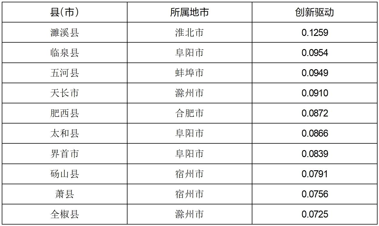 (3)安徽县域创新发展分析。根据每万人发明专利授权量、产业结构高级化及邮电业务总量等指标的综合测评结果显示,濉溪县、临泉县、五河县、天长市、肥西县、太和县、界首市、砀山县、萧县和全椒县等县(市)名列前茅。从地区分布来看,阜阳有3个县(市)进入全省前十位,滁州和宿州均有2个县(市)进入全省前十位,淮北、蚌埠和合肥各有1个县(市)进入全省前十位。