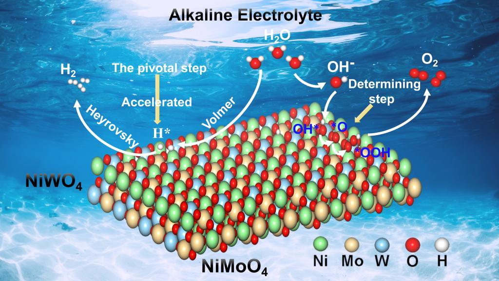 (NiMoO4/NiWO4在碱性环境下的电催化反应机理示意图)