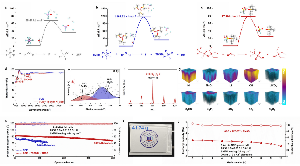 无钴锂镍锰氧化物(LiNi0.5Mn1.5O4,LNMO)正极因其高工作电压(约4.7 V)和低成本,被认为是高能量密度储能系统的理想候选。然而,传统碳酸酯电解液难以在高电压下保持稳定,且与电极兼容性差,限制了其实际应用。团队提出一种协同抑制策略,在常规电解液中引入两种硅基添加剂——三乙基硅基三氟甲磺酸酯(TESOTf)与三(三甲基硅氧基)硼酸酯(TMSB),实现了Li-LNMO电池在4.9 V高电压下的稳定循环。研究表明,TMSB可络合游离的六氟磷酸根阴离子(PF6⁻),而TESOTf优先与痕量水反应,从而抑制锂盐六氟磷酸锂(LiPF6)的水解及氢氟酸(HF)的生成,减少正极副反应。电化学测试表明,该电解液显著提升了Li-LNMO电池的倍率性能(10C下85.2 mAh g⁻¹)、循环寿命(5C循环500次容量保持80%)及高温稳定性(60°C、5C循环300次)。基于此策略组装的3Ah Li-LNMO软包电池能量密度超过300Wh kg⁻¹。研究不仅揭示了硅基添加剂在高电压正极保护中的协同作用机制,也为高能量密度锂电池的开发提供了新路径。
