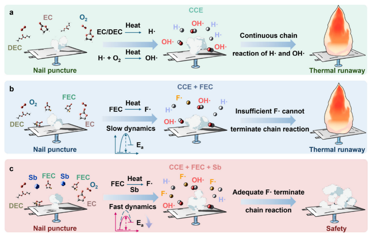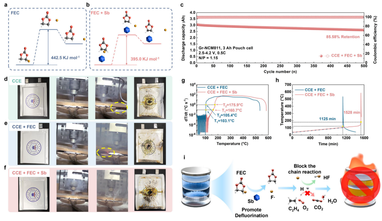 有机电解液的易燃性是锂离子电池安全性的关键挑战之一,传统提高电解液安全性的策略通常依赖大量含氟阻燃剂,但这会牺牲离子电导率并引发环境问题。基于这种思考,团队开发了一种液体有机锑化合物——三乙醇锑(Sb(OEt)₃),作为电解液的阻燃增效剂,仅添加0.5 vol% 的Sb(OEt)₃与5 vol% 的氟代碳酸乙烯酯(FEC)搭配,即可显著提升电解液的阻燃性,并改善其电化学性能。机理研究表明,Sb(OEt)₃在热分解过程中能生成Sb₂O₃,该产物可催化FEC的脱氟反应,降低氟自由基(F·)的生成能垒,从而中断燃烧链反应,抑制火焰传播。此外,Sb(OEt)₃的引入还改善了Li–石墨(Gr)和Li–NCM811半电池的循环稳定性与倍率性能。基于该电解液组装的3 Ah Gr–NCM811软包电池在500次循环后容量保持率高达85.6%,针刺与加速量热测试进一步验证了Sb(OEt)₃的阻燃协同效应。该研究为新型阻燃机制的探索及高安全锂电池的开发提供了重要思路。