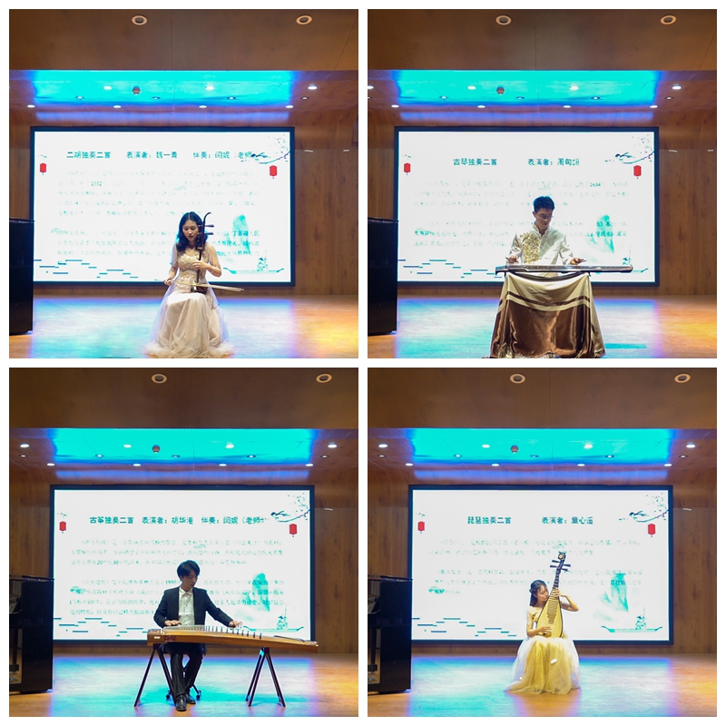 听赏会在二胡独奏《烛影摇红》中正式拉开帷幕,在学生的精彩演绎中,乐曲被赋予了更加昂扬向上的新时代精神;《葡萄熟了》则以其欢快、生动的曲调展现了少数民族载歌载舞的美好生活,进一步活跃了音乐会现场氛围。竹笛独奏《姑苏行》《牧民新歌》与古琴独奏《平沙落雁》《流水》或舒缓柔美,或磅礴大气,带领听众感受到民族乐器古色古香的文化底蕴,赢得台下观众的声声赞许。琵琶独奏《阳春白雪》《彝族舞曲》曲调激昂、铿锵有力,将听赏会氛围推向高潮,现场掌声雷动。听赏会在精彩的古筝独奏《渔舟唱晚》《临安遗恨》中圆满结束。
