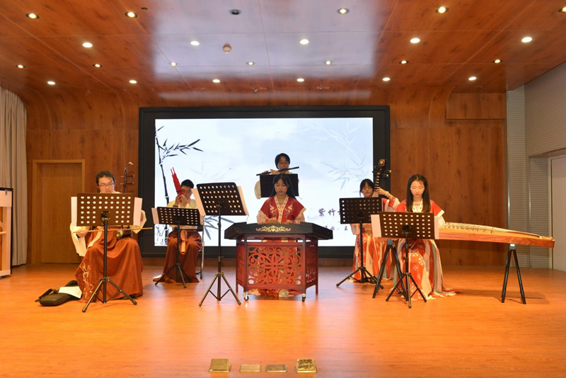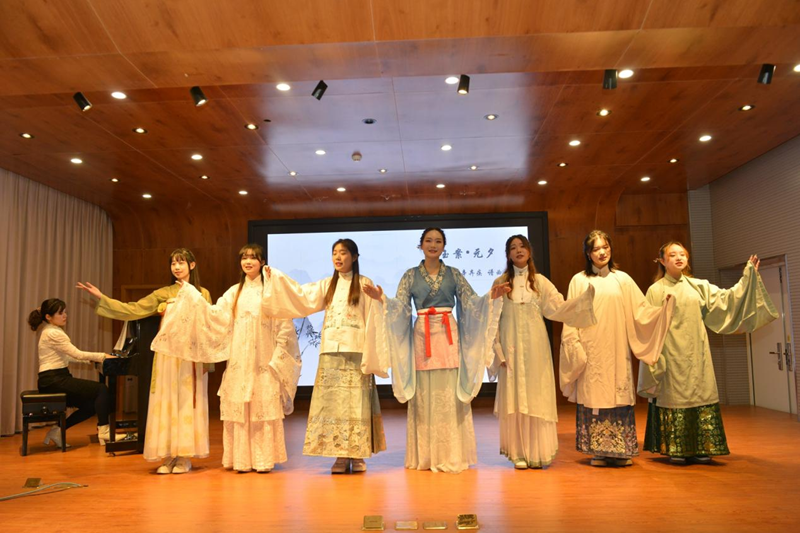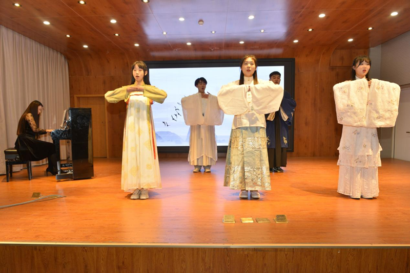 民乐合奏《彩云追月》曲调轻盈欢快、婉转流畅,拉开听赏会帷幕。《紫竹调》延续着轻松活泼的风格,展示了民歌小调的独特魅力。《南乡子·登京口北固亭有怀》一改轻快,歌声随琴音流动,如长江之壮阔波澜、如壮士之悲壮高亢,唱出了英雄悲歌、唱出了家国深情。《阳关三叠》、《花非花》、《越人歌》这些耳熟能详的诗词以音律为载体,或叹别离、或颂真情、或思人生,唱出人生百味,在动人韵律中重现古人真挚的情感。男声雄浑、女声温婉,相辅相成,韵味深永。钢琴独奏《山火》以欢快激昂的节奏,点燃全场,掌声喝彩迭起,将氛围推向高潮。钢琴、古筝合奏《红颜劫》情感真挚、曲调动人,中西音乐文化亦在琴音交织间交融碰撞。《点绛唇·赋登楼》、《红豆词》、《青玉案·元夕》等词曲的演绎生动婉转,展现了古代人民饱满充盈的精神世界和对美好生活的热情追求,曲声悠扬,充满开阔朦胧的浪漫气息,尽显中国古诗词音乐的意境之美。听赏会在合唱《水调歌头》圆满落幕,余音绕梁、掌声不断。