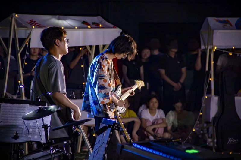 时舞社编排的《九边型战士》舞动着火一般的热情,以高频的节奏旋律带动大家,让现场的热情氛围不断攀升。逝光乐队带来的《let it be》《21 guns》《夜空中最亮的星》《一如往常》《山海》时尚多变的曲风,鲜明洋溢的曲目,表达了青年学子昂扬的人生态度和坚定的人生追求。原创个人说唱绽放青春的活力与魅力,引起观众们的阵阵尖叫与呼喊声。随着夜幕降临,现场气氛越发浓烈,彩色的荧光棒与舞台灯光交相辉映,汇聚成光的海洋。音乐节在逝光乐队的《drain you》中落下帷幕。
