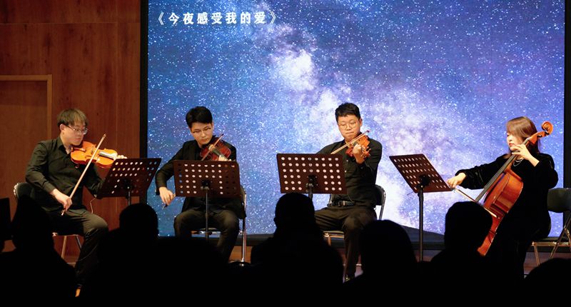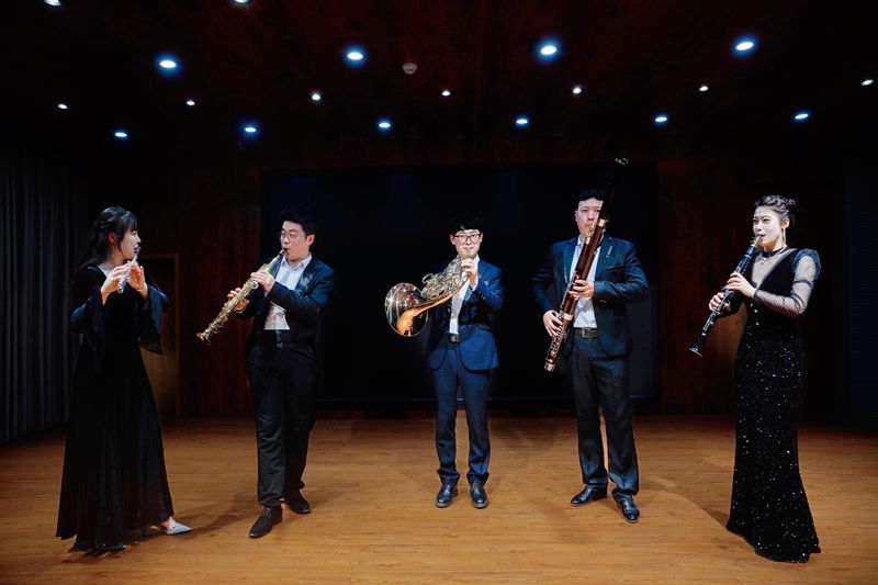 入场开始,主持人介绍木管五重奏的音乐表演特点,吴奕昕等五位老师现场为观众进行各个乐器的独奏展示。听赏会以一首《卡门组曲》拉开帷幕,以色彩斑斓的曲调呈现一幅充满异国情调的音乐画卷。木管五重奏《梁祝》以优美的长笛奏响经典旋律,通过木管、铜管此起彼伏的合奏将梁祝爱情的美丽和悲剧展现得淋漓尽致;《第二圆舞曲》采用三拍子华尔兹舞曲的律动,以单簧管主奏旋律声部传递出欢快情感;弦乐四重奏《花样年华》以轻柔的钢琴旋律为主线,搭配温暖的弦乐和轻快的打击乐器,引领听众进入一个宁静而悠扬的音乐空间;《瑶族舞曲》抒情柔和的高音萨克斯交织嘹亮恢弘的圆号,奏出瑶族千年文化精髓;《今夜感受我的爱》第一小提琴的悠扬曲调搭配中提琴和大提琴,深沉而富有表现力,展现逆境重生风采。听赏会在《我和我的祖国》欢快的旋律中结束,现场掌声连绵不断。