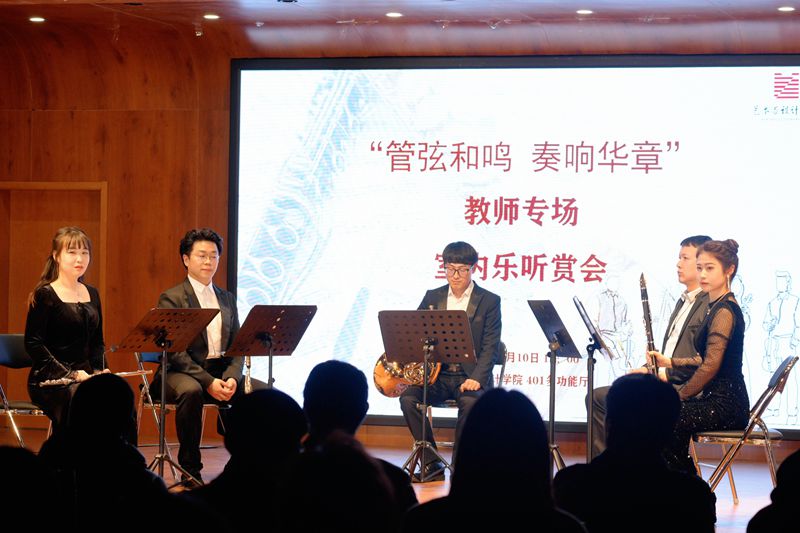 12月10日晚,学校在艺设楼401多功能厅举办“管弦和鸣 奏响华章”教师专场室内乐听赏会。安徽省指挥家协会常务理事、马鞍山市管乐团首席指挥朱鸿,马鞍山市管乐协会主席、管乐团团长郭峰,马鞍山市音乐家协会副主席、市管乐团首席长笛李祥瑞,以及艺术与设计学院教师倾情演绎。艺术与设计学院领导班子成员、师生代表和全校音乐爱好者共享视听盛宴。