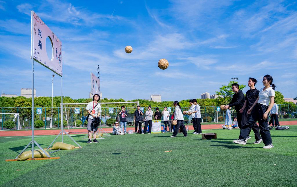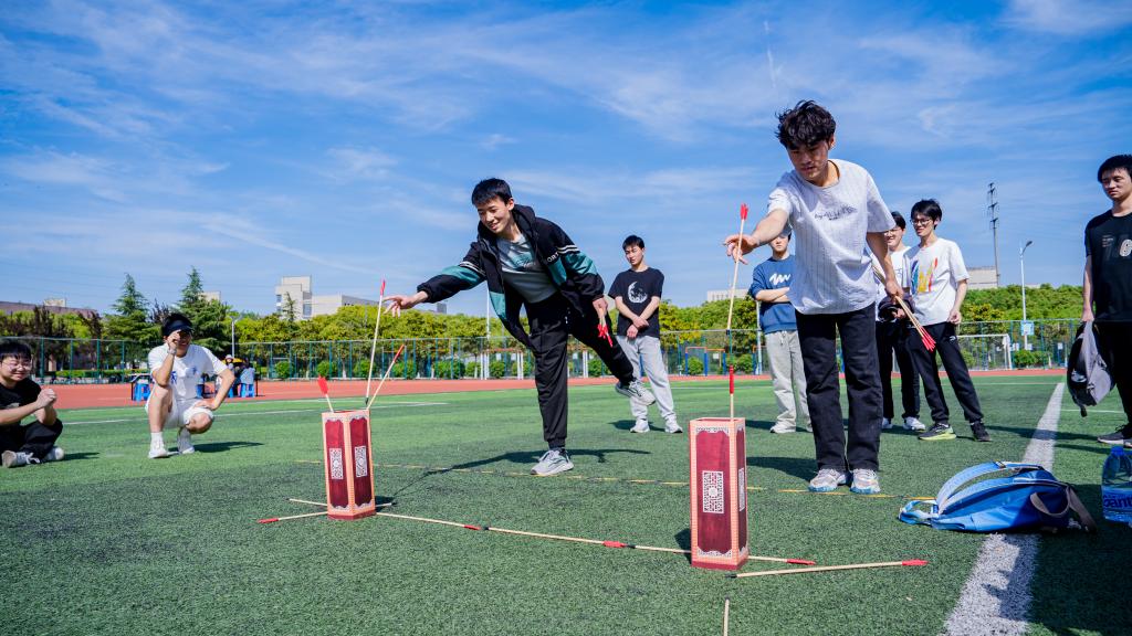 在趣味运动会中,跳绳区域的选手们轻盈跃动,绳子在空中划出优美弧线,计数声与喝彩声交织成欢快的乐章;踢毽子场地,五彩毽子上下翻飞,队员们眼疾脚快,用巧妙技巧演绎传统游戏的灵动趣味。蹴鞠、袋鼠跳、同舟共济、投壶、踩气球环节更是气氛爆棚。